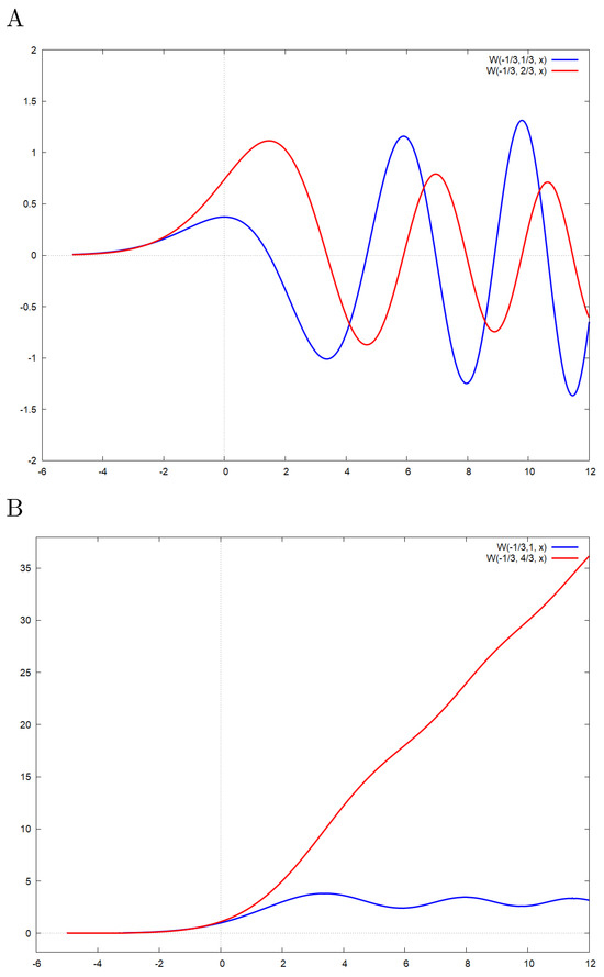 A plot is presented in Figure 2A. Regarding the Mainardi function , Equation (31) simplifies as expected for to the Airy Ai function, which can be represented as a weighted sum of Bessel J or I functions, respectively. That is, for