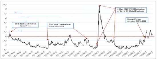 Figure 1 plots the daily index of FSI and plots a graph line for the sample period from 16 July 2016 to 9 July 2023. From July 2016 to February 2020, FSI remained below the average line, except for a single spike in 2018 for a shorter time span. This established that global economies were recovering after the global financial crises of 2008. The policies and structures incorporated to tackle such crises and policies strengthen the confidence of investors and the business community to participate in economic activities and make investment. In the interim, decision-makers focused on developing policies and precautionary steps to avert crises of this nature. The period from 2012 to 2017 is particularly captivating because of the positive bubble in the US currency and the negative bubble in the oil market []. Moreover, a short span stress spike cropped up during the last quarter of 2018 due to the US-China trade conflict []. Throughout the sample period, the largest stress spikes were observed during the COVID-19 period from the end of the first quarter of 2020 to the end of the second quarter of 2022. On 11 March 2020, the WHO declared COVID-19 as a global pandemic [], and in April 2020 suggested lockdown. Lockdown caused a sudden rise in financial stress from the beginning of the second quarter of 2020 []. With the relaxation of lockdown, financial stress decreased below the average line and financial conditions remained stable from the end of the second quarter of 2020 through the last quarter of 2021 as seen in the graph. The FSI graph line again exhibited a rising trend from February 2022 because of the Ukraine–Russia war [], Russia invaded Ukraine on 24 February 2022. The stress time span is longer during this period, with the FSI line remaining above the average line from February 2022 to December 2022. For the remaining period till July 2023, the FSI graph remained stable on the average line.