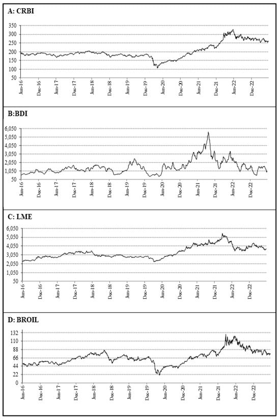 Panel C plots the graph line of LME, interestingly showing a similar pattern from the beginning of the sample period, during the US–China trade conflict in 2018, and the COVID-19 crises in 2020, as well as a similar pattern after the COVID-19 recovery period. It was different during the Ukraine–Russia war and showed a sharp declining trend, remaining unstable during the period as compared to CRBI.