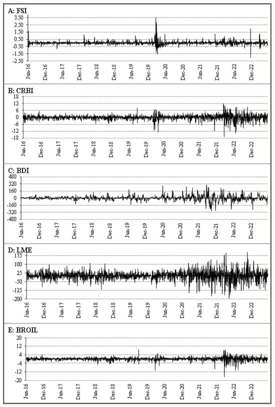 Figure 3 plots the daily change of the FSI and the commodity indices selected for this study. Daily change pathways show volatility clusters and high volatility. The FSI index daily change shows variation spikes in different time periods. When we plotted temporal changes of the FSI, stress spikes were observed during global stress events in the sample period, i.e., US–China trade tension, COVID-19 pandemic, and the Russian invasion of Ukraine. The highest stress spike observed during the COVID-19 pandemic from early 2020 to mid-2021 which is the steepest in the whole sample period. The Ukraine–Russia war is represented in the graph as the second stressful event, but this event lasts longer than the COVID-19 pandemic. FSI, CRBI, and BROIL exhibited similar patterns and likeness in their volatile periods like trade tensions, COVID-19, and the Ukraine war. BDI and LME exhibited more volatile patterns than the others. From February 2018 to February 2020, a few factors may have contributed to the increased volatility of these indicators, i.e., trade tensions during this period, as trade tension escalated between the US and China, as well as between other major trading partners. This uncertainty and disruption to global trade flows likely contributed to the BDI’s volatility. There were several instances of political instability during this period, including Brexit, protests in Hong Kong, and the ongoing conflict in the Middle East. These events may have contributed to the LME’s volatility, as investors reacted to the potential impacts of these events on global economic activity. The LME and BDI followed similar patterns in extreme events like COVID-19 from March 2020 and the Russia–Ukraine war from February 2022 onwards.