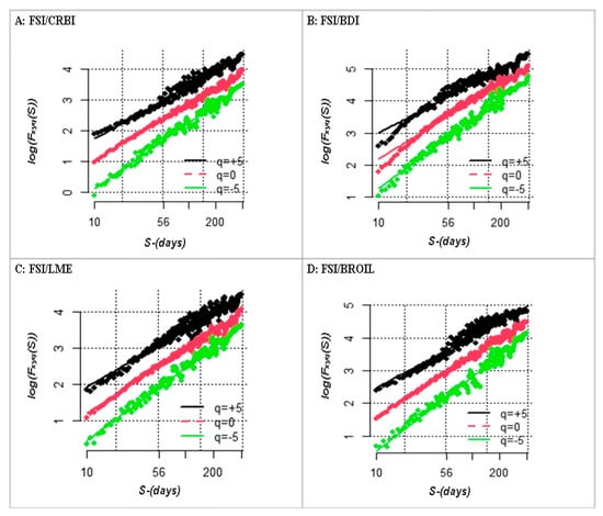 To compute the cross-correlation between FSI and commodity indices’ daily changes, we applied the existing multifractal detrended cross-correlation analysis. We determined the variability function Fxyq (S) by increasing scaling order q from −5 to 5 step by step length, in line with the number of observations. Figure 4. plots the log-log movement of Fxyq (S) depends on the time span s (days) between FSI and commodity indices’ daily changes of CRBI (Panel-A), BDI (Panel-B), LME (Panel-C), and BROIL(Panel-D). The lines rising from lowest to the highest relate to subsequent scale orders for q = −5, q = 0, and q = +5. It is clear that is well-shaped and exhibits an increasing trend with the gradual linear rise with the scale s orders, showing there is a power law correlation between FSI and four time series of commodity indices.