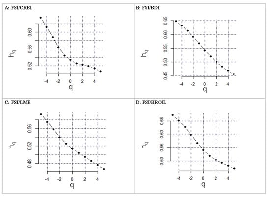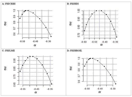 The findings of singularity ratio C are reported on the right side of the last column of Table 4, where FSI–BDI is (0.7607) followed by FSI–LME (0.541) then FSI–BROIL (0.469) and the least value of FSI–CRBI (0.302). Interestingly, similar to the findings of , all commodity market indices showed , indicating strong singularities and the cross-correlations have a multifractal formation that reacts promptly to local fluctuations even with small variations [].