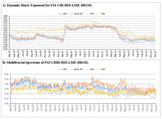 We use the MFDCCA with the rolling window technique to capture the dynamic changes in the cross-correlation between the FSI and the commodity market indices of CRBI, BDI, LME and BROIL. In Figure 7, Panel-A shows the evolution of the Hurst exponent (Q = 2) across a rolling window of 500 trading days, whereas Panel-B shows the daily variations in multifractal strength. It is easily seen that the BDI exponent line remained above the other three commodity pairs and above 0.5 until July 2022, demonstrating a persistent cross-correlation between the daily changes of BDI and FSI. For the other three commodity indices (CRBI, LME and BROIL), the respective Hurst exponents are lower than 0.5 and anti-persistent with FSI before March 2021, known as the COVID-19 pandemic period. Their Hurst exponent value increased intermittently and touched 0.5, remaining there from September to November 2020, which indicates the weakness (or absence) of cross-correlation between FSI commodities CRBI, LME, and BROIL. This implies the weak knowledge of commodity prices about FSI during these months due to uncertainty and on/off episodes of COVID-19 lockdowns after the first pandemic phase. Before and after, the FSI was likely to be negatively followed by CRBI, LME, and BROIL. Interestingly, during the COVID-19 recovery period, from March 2021 to April 2022, these three commodity indices jumped above the threshold of 0.5, remaining above the parameter and showing a strong level of persistence with FSI. This implies that the FSI is negatively followed by commodity prices. After April 2022, all four commodity indices’ Hurst exponents dived and crossed the 0.5 threshold, showing persistence with the FSI, meaning that an increase in FSI was followed by the commodity market indices. This flip in the relationship between FSI and commodity market indices happened because of the Russian invasion of Ukraine from February 2022. The BROIL has the highest multifractality based on DH value, whereas LME demonstrates the lowest multifractal cross-correlation with the FSI, which is consistent with the overall results. In general, all commodity indices percentage changes in 2020 exhibit significant multifractality in contrast to slightly lower DH values in the months following March 2022.