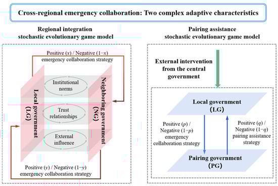Regional integration and pairing assistance are the innovative practices of cross-regional emergency collaboration in China. To explore the interaction and behavioral relationship between different game subjects in cross-regional emergency collaboration, here, the regional integration and pairing assistance stochastic evolutionary game models were constructed based on CAS theory and EGT. Then, the decision-making process and influencing factors of the game subjects were explored through a numerical simulation analysis. The research results showed the following: