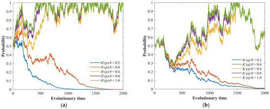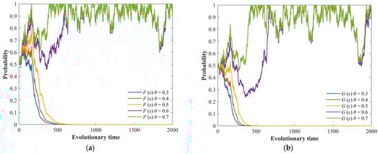 The stochastic evolution process of the game system under different efficiencies of emergency collaboration, θ. (a) Evolution process of the LG’s strategy. (b) Evolution process of the PG’s strategy.