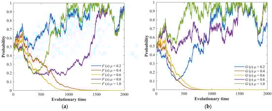 The stochastic evolution process of the game system under different driving coefficients of emergency collaboration, μ. (a) Evolution process of the LG’s strategy. (b) Evolution process of the NG’s strategy.