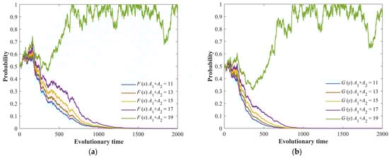The stochastic evolution process of the game system under different emergency capital stocks, A1 + A2. (a) Evolution process of the LG’s strategy. (b) Evolution process of the NG’s strategy.