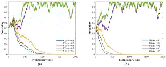 The stochastic evolution process of the game system under different externality coefficients, ε. (a) Evolution process of the LG’s strategy. (b) Evolution process of the NG’s strategy.