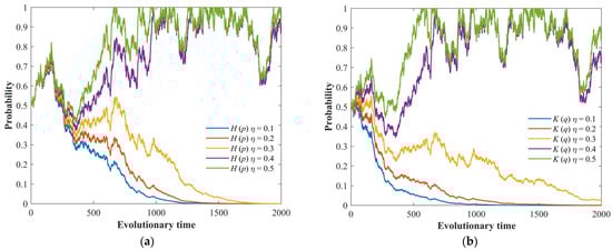 The stochastic evolution process of the game system under different matching degrees of government-to-government, η. (a) Evolution process of the LG’s strategy. (b) Evolution process of the PG’s strategy.