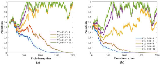 The stochastic evolution process of the game system under different rewards, E, and compensations, M. (a) Evolution process of the LG’s strategy. (b) Evolution process of the PG’s strategy.
