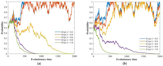 The stochastic evolution process of the game system under different coefficients of sustainability, λ. (a) Evolution process of the LG’s strategy. (b) Evolution process of the PG’s strategy.