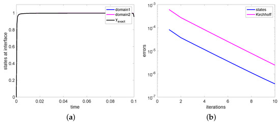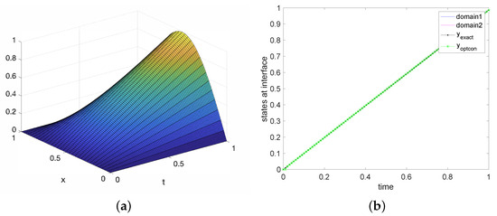 In the first example, we consider an exact solution for comparison. We rearrange the intervals such that their union, after a proper change of variables, can be represented by . We take ; correspondingly, we take the right-hand side . Now, we take as the target the solution , meaning that the adjoint is effectively zero everywhere and the optimal state is the exact solution. We take the parameters (see Remark 2) and start with zero initial data. We start the iterations with zero values. For the discretization, we choose spatial points and time points. In the first part of the experiment, we take the domain decomposition algorithm based on the optimality system (DD for the OS) (4), (5), while in the second part of the experiment we take the domain decompostion for the virtual optimal control problem (DD for the virtual OCP) (6), (5). In both cases, we take the same process parameters in order to ensure a good comparison. In the first part we solve the local optimality systems in each iteration, while in the second part we invoke an optimization routine for the corresponding virtual control problem. For the latter, we take IPOPT as the optimizer, which uses the MUMPS linear solver. The package we use is CASADI-OPT https://web.casadi.org/ (accessed on 10 January 2024). Clearly, the optimal choice of the parameters depends on the penalty parameters , and the choice may differ depending on the method; here, we keep both sets in order to make for a better comparison. Of course, when using the optimization approach for the virtual control problem, the IPOPT solver again employs a number of parameters, which makes a very precise numerical comparison of this matter difficult. In Figure 1, we show on the left (Figure 1a) the states on the two sub-domains and on the right (Figure 1b) the states at the interface . As a result, there is no visible difference between the results obtained from the iterations (4) and (6). The corresponding errors of the states and the derivatives are shown in Figure 2.