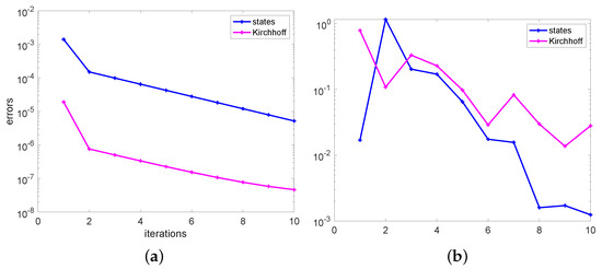 Errors at the interface for the DD of the virtual OCP, different discretizations: example 2. (a) Errors at interface Nx = 10. (b) Errors at interface Nx = 40.