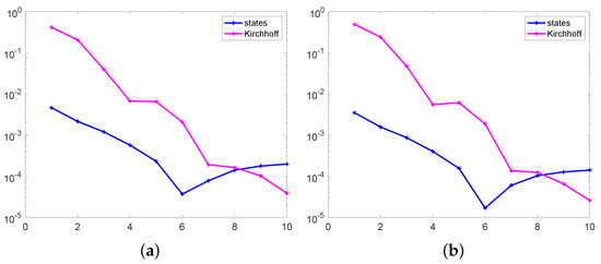- discretization of the Kirchhoff condition at , as follows:Now, considering Equation (2)1 at while approximating the fractional derivative by (40) and using the above formula, we obtainFinally, summing up over all edges in the above expression and using Equation (2)4, we obtainwhere .