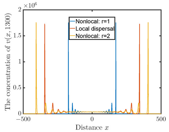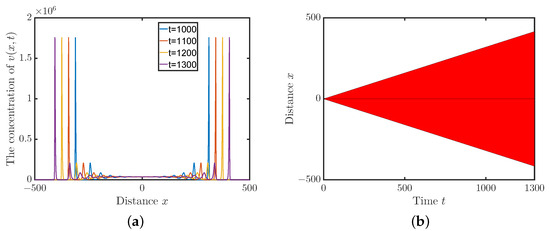 - Choose an appropriate spatial domain and then discretize it. We take the domain to be . The discretization step size is , which results in 5001 ordinary differential equations. Under our specified parameters and initial values, the viruses are always away from the boundaries of the domain during our simulation.
