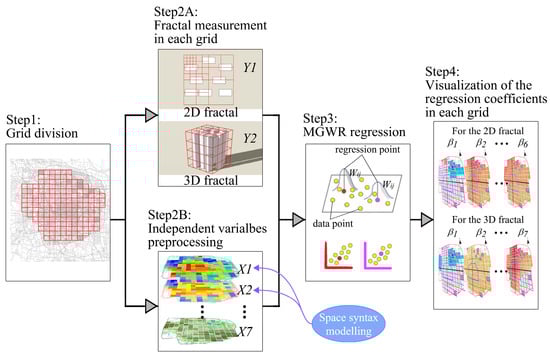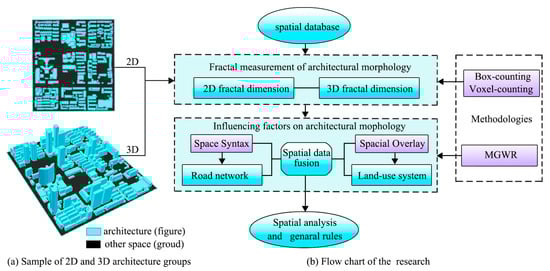 This study uses architectures as fractal objects and conducts fractal measurement within the subzone through 2D and 3D box (voxel)-counting methods, then the fractal features are mapped to obtain a fine-scaled portrait of urban morphology. Finally, a multiscale geographically weighted regression (MGWR) model is established to explore what effects the road network and land-use patterns have on urban morphology (Figure 1b).