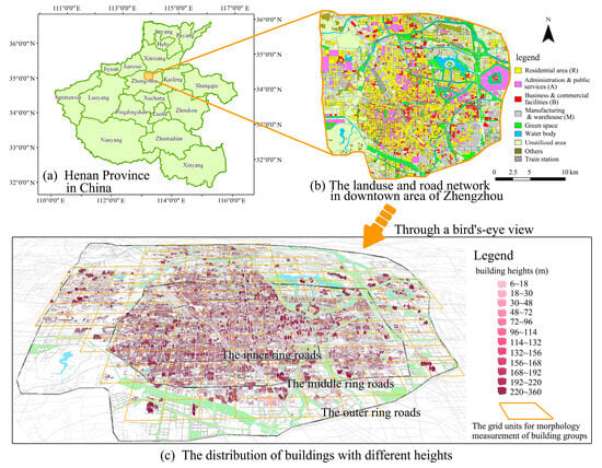 The city of Zhengzhou is chosen as the case study (Figure 2a). As the provincial capital of Henan, Zhengzhou’s metropolis area has a dense and diverse architectural complex, providing a sufficient sample size for supporting urban fractal research. (Fractal research can still be conducted in cities lacking dense and diverse architectural complexes, but the overall fractal dimension may be low, making it challenging to analyze the local spatial variations of fractal dimensions at the subzone level [35]).