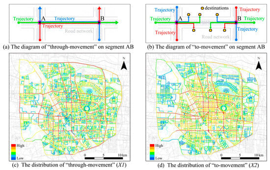 In terms of the road network, the Choice index is selected as X1 to estimate the traffic flow of “through-movement” (e.g., a higher Choice index value corresponds with more through-movement trajectories in segment AB, Figure 4a). The Integration index is selected as X2 to estimate the traffic flow of “to-movement” (e.g., a higher Integration index value corresponds with more to-movement trajectories in segment AB, Figure 4b). According to pertinent research, there is a significant correlation of 70% between the aforementioned indicators and their corresponding actual traffic flow [41]; the distributions of “through-movement” and “to-movement” are mapped in Figure 4c,d, respectively. Finally, the node number of the road network is counted in each grid and defined as X7, which is mapped in Figure 5e.