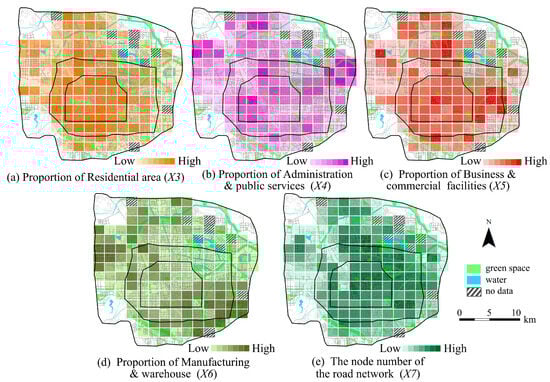 In terms of land use, the proportion of the residential area is selected as X3 to estimate the level of residential functionality. The proportion of administration and public areas is selected as X4 to estimate the development level of these facilities. The proportion of business and commercial areas is selected as X5 to estimate the business vitality. The proportion of manufacturing, industrial, and warehouse areas is selected as X6 to estimate the industrial development level. Each land patch possesses distinct functional attributes and well-defined spatial boundaries, devoid of any inaccuracies. The relative proportions of different land areas within each grid can be determined by overlaying the vectorized land-use map (Figure 2b) onto the 158 grids spatially (Figure 5a,d).