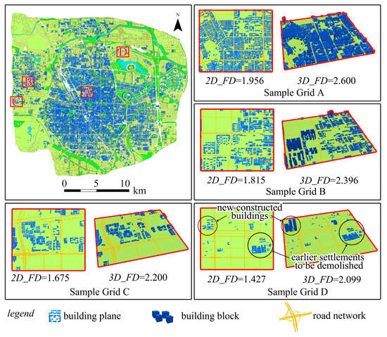 The grid D sample represents the vacant place to be developed, where the road network has just been formed but the new planned buildings have not yet been “filled” into the urban framework. In these areas, the architectural groups are sparse and unevenly distributed. High-rise buildings that have already been built stand within a few plots, and some other low and shabby buildings are clustered within earlier settlements to be demolished. These features result in the lowest values of 2D_FD and 3D_FD indices.