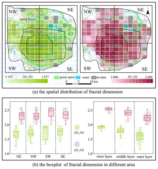 The 2D_FD and 3D_FD values of the 158 grids are computed and mapped in Figure 7a to obtain an overall grasp of urban form; the boxplot graphics of different partitions are drawn in Figure 7b for morphological comparisons between different directions and different layers of the city.