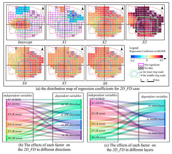 The regression coefficients of the six independent variables for 2D_FD exhibit spatial heterogeneity, as depicted in Figure 8a. The X1 factor (through-movement flow) exerts a negative influence in the northeastern direction within the outer and middle layers while demonstrating a positive impact in a limited area along the northwestern edge. However, its effect is not statistically significant in other regions.