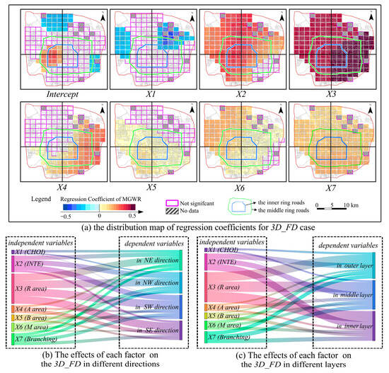 From Table 1, the fitting effect of MGWR is much better than those of the conventional OLS and GWR regression models. The MGWR regression obtains lower RSS, AIC, and AICc values and higher R2 and Adjusted R2 values in both the 2D_FD and 3D_FD cases, reflecting the advantages of a stronger explanation for the dependent variable in MGWR compared to traditional regression models. Moreover, the 2D_FD case obtains lower RSS, AIC, and AICc values and higher R2 and Adjusted R2 compared to the 3D_FD case. In other words, the 2D architectural pattern can be more easily explained by the independent variables compared to 3D morphology.