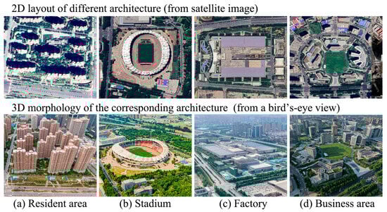 Different spatial samples are featured with different architectural layouts, corresponding to different fractal dimension values. The purpose of this section is to establish the correspondence between fractal dimensions and their visualized presentations and to portray urban morphology more vividly. Therefore, four typical grids representing different development patterns are selected as samples (Figure 6), in which urban morphology is compared through 2D_FD and 3D_FD values.