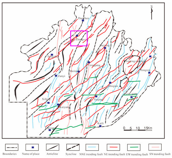 The Anchang syncline is located in the Wuling depression between the southeastern edge of the Middle and Upper Yangzi Massifs and the Xuefeng Mountain basement detachment orogenic belt (Figure 1), which is the western side of the Sichuan eastern compartmentalized trough fold belt. Tectonically, it is located north of Guizhou Province and is part of the northeastern tectonic deformation area of the Yangzi quasi-platform, Qianbei Plateau, convex Zunyi fault, and Fenggang north-northeast tectonic deformation zone. The northern region of Guizhou Province exhibits notable structural features characterized by prominently developed synclines and fault structures. These folds predominantly exhibit a consistent northeastern to north-northeastern orientation, and they are mainly divided trough folds, with narrow and tightly closed, steeply dipping troughs and banded distributions on the surface. The backslopes are wide and gradually sloping in the form of a box and often exhibit the characteristics of compound structures, while internal extrusion tectonics, such as lenticular bodies, rubbing folds, compressive faults, and slip tectonics, are very well developed. The fold axis is generally an NNE–NE arc-like curve. Fractures in the fold belt are extremely common, with the main strike occurring in the NE–NNE direction, mostly in the core and wings of the dorsal slope, and the fractures are mostly retrograde in nature, with a small number of positive fractures also present. The Anchang dorsal slope is located in the weak–medium deformation zone in northern Yunnan–Guizhou, which is a negative tectonic unit formed against the geotectonic background of the Early Paleozoic era, whereas the positive tectonic attributes of the southern neighboring East Yunnan–Guizhou–China uplift are exactly the opposite, but the formation and development processes of these two structures are complementary and closely related. Deformational tectonics in the deformation area were mainly formed during the Yanshan main fold orogeny in the Early Cretaceous period, and the typical tectonic type is the syncline fold-and-rupture combination with folds, which is a straight torsion tectonic type.