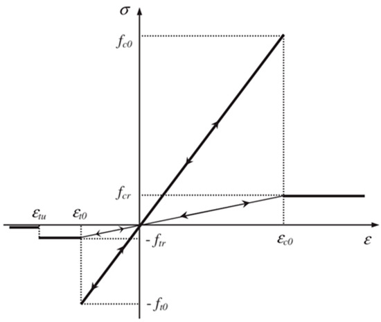 In Equation (4), σtr is the residual compressive strength of the unit; σt0 is the ultimate compressive strength of the unit; σrt = λσt0; λ is the residual compressive strength coefficient, and 0 < λ < 1. Moreover, εt0 is the compressive strain of the unit at the elastic limit, which is the strain threshold for compression damage, and εtu is the ultimate compressive strain of the unit when it is completely destroyed. Finally, εtu = ηεt0, where η is the ultimate compressive strain coefficient.