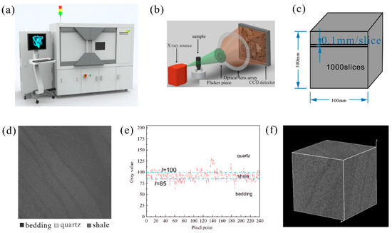CT scanning and digital image characterization process. (a) X-ray 3D microscope-equipped nanoVoxel-4000 system; (b) CT scanning schematic; (c) CT scanning frequency; (d) 2D CT slice image; (e) grayscale value scanning map; (f) constructed laminated shale model.