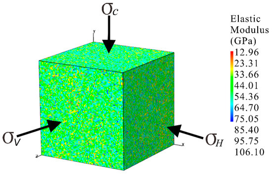 The images were numbered sequentially and converted into model data. The data were then stacked along the z-axis and imported into RFPA3D to reconstruct a 3D structural model. A cubic volume unit was used to measure finite quantities. To characterize the different fine-grained materials in the shale specimen, the image was converted into multiple finite element cubes. Given the nonuniformity of the material, it is proposed that the mechanical properties of the fine-grained cells follow the Weibull distribution, expressed as Equation (8) [27].