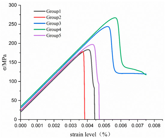 In the course of triaxial compaction, the stress–strain curves of shale samples manifested three distinct phases, as illustrated in Figure 5: During the elastic stage, the stress–strain relationship demonstrates linearity with a consistent slope, alongside the gradual advancement of microscopic ruptures. In the nonlinear deformation stage, the slope of the curve decreases as the loading level exceeds approximately 70–80% of the peak strength, indicating that the stress continues to cause specimen damage and decrease the force. The elastic potential energy stored is released, resulting in irreversible deformation, which in turn causes the compaction of some cracks. The stress in the shale specimens of Groups 1, 2, and 5 sharply decreases after the peak phase; the internal microscopic cracks expand through the specimens and form macroscopic main cracks; and the specimens are destabilized and damaged. Similarly, as the post-peak curves decrease almost perpendicularly, irreversible plastic distortion occurs, and the load carrying capacity gradually decreases to 0. The specimens of Groups 3 and 4 still provide a certain load-bearing capacity after failure. Cracks do not penetrate all the way through the specimens at peak stress. When the loading process is continued, new cracks are formed and continue to branch out; the time when the main fracture emerges and when the specimen emits the loudest sounds, therefore, lags behind the ultimate load.