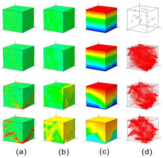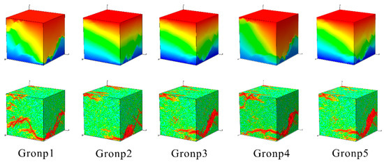 The Monte Carlo method was utilized to assign values to the material components based on color and to input the corresponding nonuniformity coefficients according to the mechanical parameters listed in Table 1. Figure 3b shows the numerical model that incorporates the actual fine-scale structure of the material. To ensure consistency, each sample was processed through digital image processing to maintain the same scale. The specimens used in the simulation were 100 mm × 100 mm × 100 mm in size, and a total of five specimens were numerically simulated. Considering the disparity between the tensile strength and compressive strength of brittle materials, RFPA3D-Basic software incorporates a tailored Mohr–Coulomb criterion as the unit damage strength criterion. The loading process involves gradually applying the load up to the predetermined perimeter pressure value, followed by the application of axial displacement once the system perimeter pressure has stabilized. The initial displacement was set to 0.001 mm, with subsequent increments of 0.0005 mm per step. Loading continued until the specimen reached a damaged state, as shown in Figure 4.