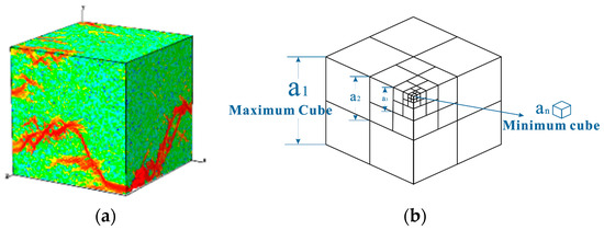 In the model constructed in RPFA3D, since the shale specimen comprises multiple cubic units of the same size, each pixel has a corresponding grayscale value [43,44]. In space, cubes of size m×n×h pixel points are divided (as shown in Figure 7). Therefore, a cubic box can be selected to cover the crack model in three dimensions. The bisection method is chosen to determine the side lengths of the small cubes.
