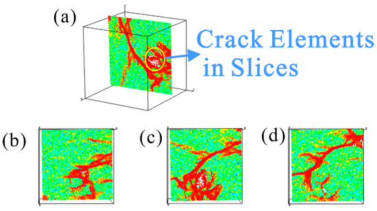 In RPFA3D, the fracture distribution map of each slice can be generated and exported. The spatial arrangement of cracks in the image was analyzed using the principles of 3D reconstruction to assess their shapes. In Figure 8, the cracks in the postprocessed slices obtained with RFPA3D are generated via a custom procedure to determine the coordinates of the pixels with cracks.