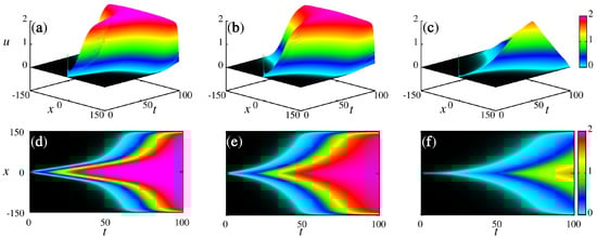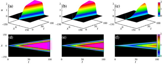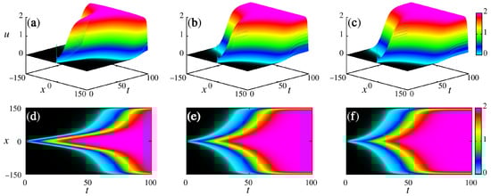 Figure 1a–c displays the 3-dimensional solution with the respective density plots in Figure 1d–f. Figure 1a,d are for (value near ), while Figure 1b,e are for (a considerable deviation of ) and the Figure 1c,f are for (a large deviation of ). At the beginning of diffusion, the Gaussian packet spreads without the influence of reaction terms. However, after a certain time, the system starts to gain the shape of logistical growth, which is limited by K. This dynamic is sharper in Figure 1a,d, while in Figure 1b,e,c,f, the packets spread with low velocity, proportionally with decrease. The decrease in the spread velocity implies a delay in reaching the steady solution.
