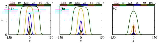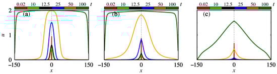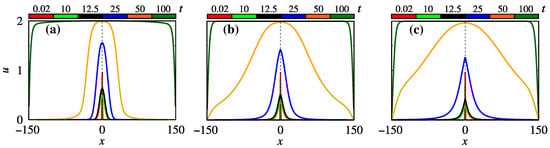 The delayed process, shown in Figure 1, is more evident when we observe the profiles in Figure 2 for (red line), (green line), (black line), (blue line), (orange line) and (dark green line). Figure 2a–c we consider , and , respectively. The amplitude of depends on the value of . The solution for reaches the steady state in approximately , and for , spends . For , the time is superior to 100. Furthermore, we verify that the Gaussian package deforms over time.