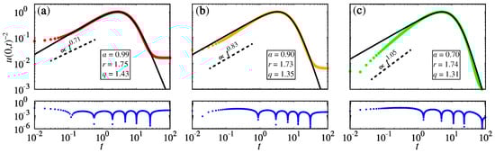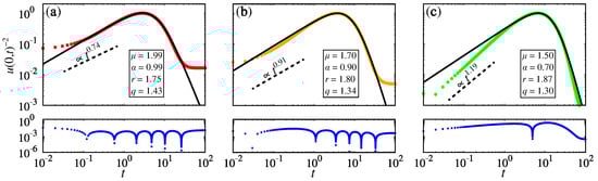 The q-Weibull adjustment depends on p0, r, t0 and q parameters. In the Figure 3a–c the black curve shows the adjustment given by Equation (9). To obtain the better parameters of Equation (9) that adjust the simulated points, we use the software Gnuplot 5.4.10 and we found the following parameters for each case: , , and for Figure 3a; , , and for Figure 3b; and , , , and for Figure 3c. For the adjusted curve generated by these parameters, we compute the Pearson correlation coefficient (r), using the package SciPy in Python [], and obtain, for Figure 3a, ; for Figure 3b, ; and for Figure 3c, . In addition, the respective mean square error is 0.012, 0.005 and 0.007. For these parameters, the respective absolute errors are displayed through blue points below the panel. Figure 3a, Equation (9) describes the points with great accuracy until , namely the time in which the distribution reaches a constant. On the other hand, as we decrease , the q-Weibull does not fit the points for with great accuracy. However, the distribution adjusts the simulated points for a long time, i.e., . It is worth mentioning that q-Weibull is a type of stretched exponential in the sense of Tsallis distributions. In this way, the stretch is governed by the powers r and q. Our results suggest that as decreases, the q parameter decreases, and the r seems to remain around .