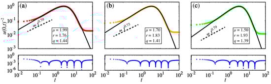 As observed in 3-dimensional and profile representation, the packet follows a distribution without the influence of reaction terms and afterward obeys the logistic growth. To quantify the spread, we use the inverse of the square of the central peak, i.e., []. Considering the normalized function , Figure 3 displays the distribution behavior of the Gaussian packet by the red points for (Figure 3a), orange points for (Figure 3b), and green points for (Figure 3c). Discarding transient time (), the displacement can be described by a power law function given by until , where the S parameter is related to the anomalous relaxation process []. However, observing the distribution , a nonlinear dynamics emerge. In this way, an adjustment given by a power law is not appropriate to capture this nonlinearity effect. In an attempt to capture these dynamics, we test q-exponential distributions []. In our simulations, the q-exponential that better fits the dynamics is the q-Weibull, which is given by