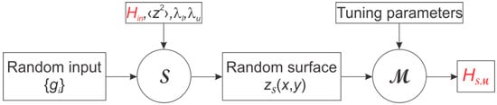 Simulated surfaces will be used to analyse the methods for estimating H. The process is illustrated in Figure 1. For Gaussian surfaces with zero mean, the input values are the variance , , , and . These are deterministic values. The surface generation algorithm acts on a finite set of random values, producing a single representation . Because of the random nature of , the mean value of and in general. Shifting and rescaling the simulated surface can correct these random variations. A numerical procedure then calculates the simulated Hurst exponent (or ), which is a random variable, which will be characterised by its mean and standard deviation.