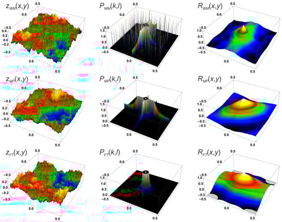 Figure 2 shows three topographies generated by WM, MP, and FT. Their differences are seen in and the autocorrelation (Section 2.7). shows many individual peaks corresponding to the individual combinations in Equation (3) and has ridges along the coordinate axes. The rotational symmetry inherent to Equation (3) is visible in as small wrinkles in the conical part of the surface. Elaborating Equation (3) is computationally inefficient and limits the use of WM for large-scale simulations.