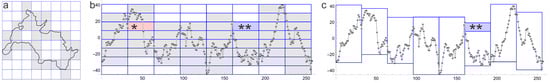 (a) Original concept of BCM as a method to estimate the Minkowski dimension of a fractal contour. The grey boxes contain part of the curve and are counted in . (b) BCM with vertical scaling. The boxes marked by * and ** are missed because the curve passes through the box, but there are no data points inside the box due to a lack of vertical resolution. (c) DBC allows for a vertical shift and counts the total range in individual intervals. Box ** is still missed.