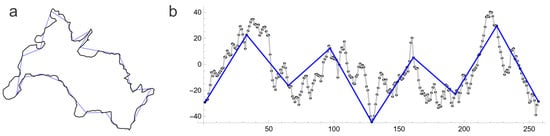 (a) Original concept of the yardstick method to estimate the Hausdorff dimension of a fractal contour. The contour is approximated by lines of a fixed length. (b) Trapezium method [] for the estimation of the fractal dimension of a time series. The length of the lines between the dots is approximated by the length of the blue lines over intervals of width a in successive refinements. By Pythagoras’ theorem, the method is sensitive to vertical scaling, and the finite resolution of the data means that the limit for can only be approached crudely.