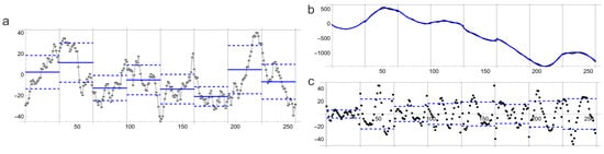 (a) Illustration of RLM for a time series. The vertical variation (standard deviation) is marked as dashed lines relative to the mean (blue line). (b) Cumulative data (black) with superposed piecewise fitting curves (blue, Equation (9)), according to DBC. (c) Fitting residuals, showing the residual standard deviation (dashed line) for each interval. Standard deviations are shown for plotting purposes; RLM and DBC use the corresponding variance.