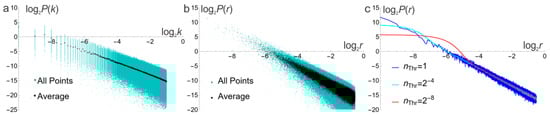 The data in Figure 6b present two inconveniences for correct regression analysis. The residual variance is not constant, and the density of data points increases strongly with r. Figure 6c shows the results of applying a low-pass filter to the average data of Figure 6b, with threshold radii . With the highest threshold, linearity is respected over the entire range, but dispersion is considerable for large values of r. As is increased, dispersion decreases, but the curve flattens for small . This phenomenon is artificial and should not be confused with an upper cutoff. For the statistical simulations reported in Section 3.3, was used, with linear regression performed for .