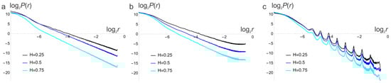 where is the gamma function, and 1F2(·) is the generalised hypergeometric function. As has zero crossings (Figure 8a), its representation in a plot is meaningless. The log–log plot for shows asymptotic linear behaviour for (Figure 8b). Figure 8c shows the average of over all points with the same for H = 0.25, 0.5, 0.75 and .