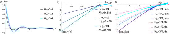 (a) presents (Equation (15)) for H = 0.25, 0.5, 0.75, and . (b) shows a plot of the theoretical value (Equation (15)), with linear fits (dashed) in the range. (c) shows the theoretical curves (th.) and simulated (sim.). The latter shows considerable horizontal offsets. Variations in H are much smaller but not negligible.