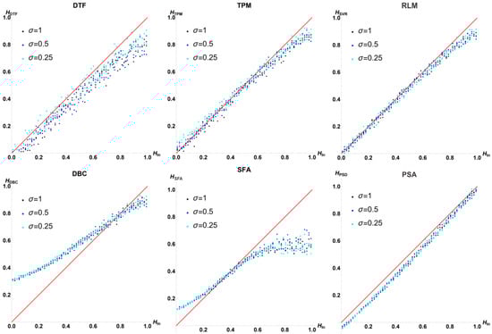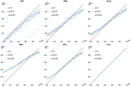 Five factors were considered in this study: the surface generating algorithm, the size of the dataset, the vertical scale , the method for calculating H, and the value of Hin. The domain is defined as a grid of points, with taking values of 8, 9, and 10. An earlier study [] showed that TPM, and to a lesser extent, DTF, depend on vertical scaling; three roughness values equal to 0.25, 0.5, and 1 are considered. The methods used are DBC, TPM, DTF, PSA, SFA, and RLM.