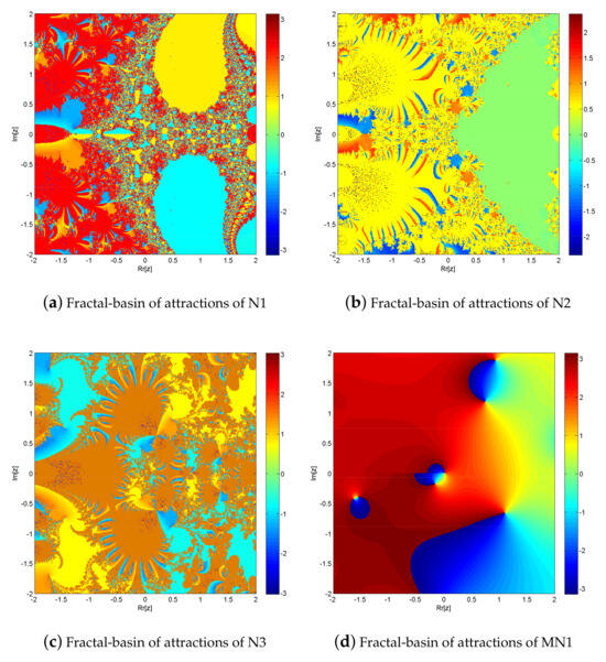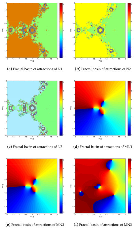 Figure 2a–g, shows basins of attraction for nonlinear function of iterative methods N1–N3, MN1–MN3, and NN, respectively.